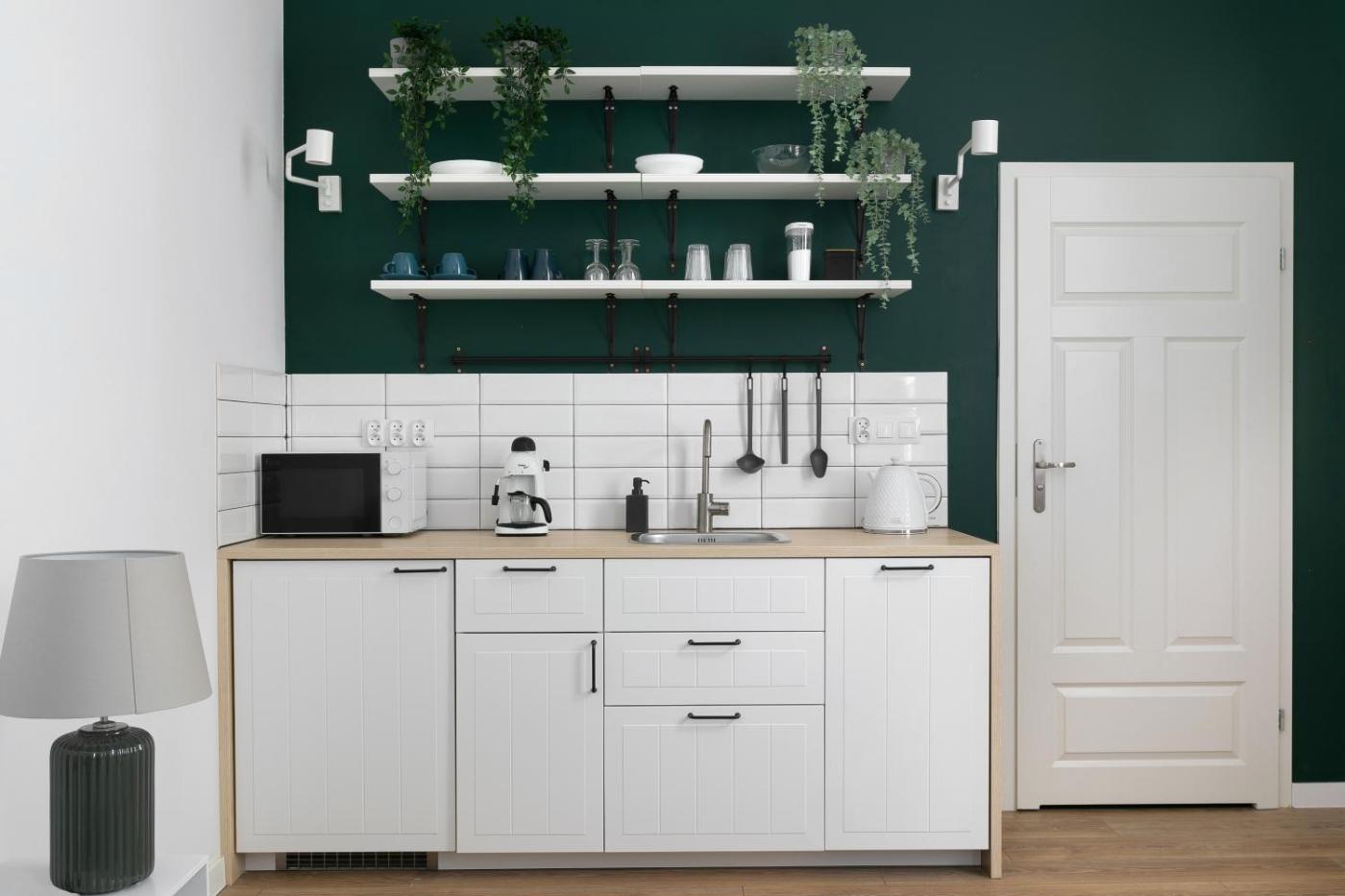 Apartament typu studio. The studio offers a dining area, a wardrobe, as well as a private bathroom boasting a shower and a hairdryer. Meals can be prepared in the well-fitted kitchenette, which has a stovetop, a refrigerator, kitchenware and a microwave. The studio features a private entrance, a tea and coffee maker, a seating area, a flat-screen TV with streaming services, as well as ancourtyard view. The unit has 1 bed. Studio - 2 osobowy. Powierzchnia pokoju ok.: 25 mkw. ;