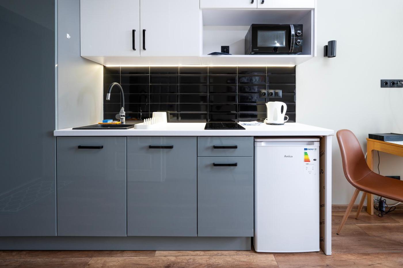 Studio. The studio offers a private entrance, a tea and coffee maker, as well as a private bathroom boasting a shower and a hairdryer. In the well-equipped kitchenette, guests will find a stovetop, a refrigerator, kitchenware and a microwave. The studio features a seating area, a dining area, a wardrobe along with a sofa. The unit has 1 bed. Studio - 2 osobowy. Powierzchnia pokoju ok.: 16 mkw.