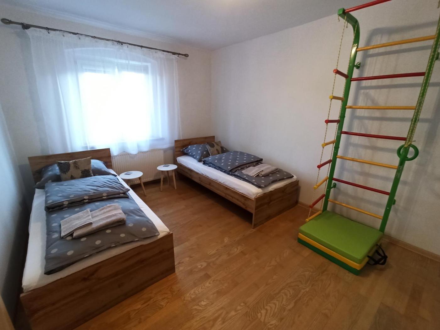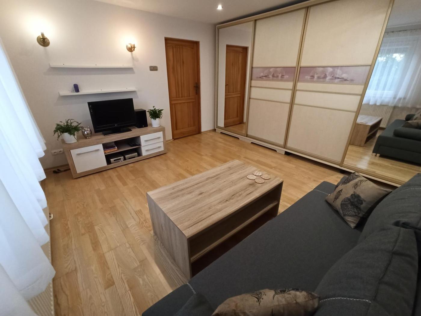 Apartament z 2 sypialniami. This spacious apartment consists of 1 living room, 2 separate bedrooms and 1 bathroom with a bath. The fully equipped kitchen features a refrigerator, kitchenware, an oven and a microwave. The apartment provides a wardrobe, an electric kettle, parquet floors, heating and a flat-screen TV with satellite channels. The unit offers 4 beds. Apartament - 5 osobowy. Powierzchnia pokoju ok.: 65 mkw.