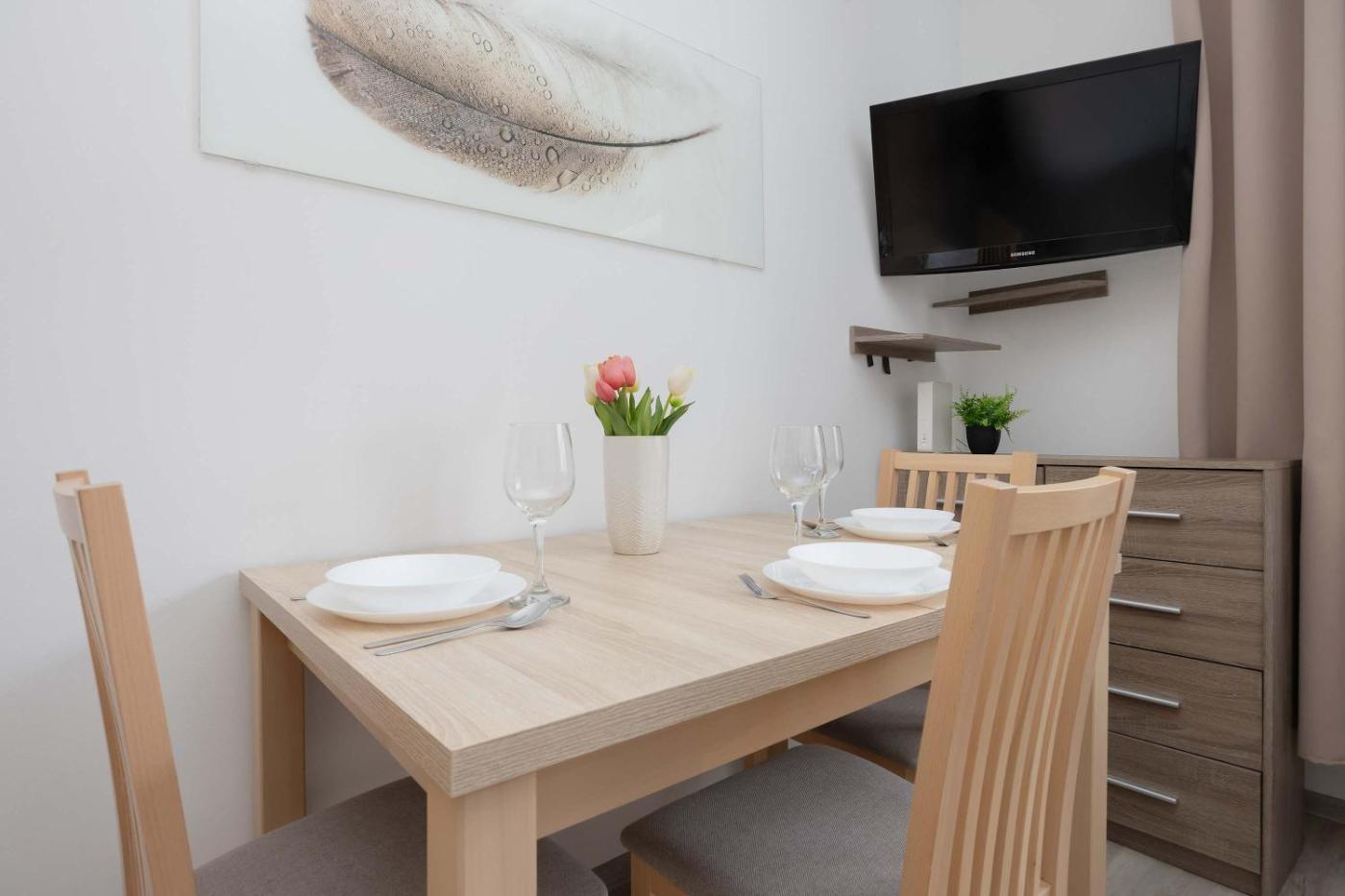 Apartament z 1 sypialnią. Boasting a private entrance, this apartment features 1 living room, 1 separate bedroom and 1 bathroom with a shower and a hairdryer. The well-equipped kitchen features a stovetop, a refrigerator, a dishwasher and kitchenware. The apartment has parquet floors, a seating area with a flat-screen TV with streaming services, a washing machine, a tea and coffee maker, as well as a dining area. The unit has 2 beds. Apartament - 5 osobowy. Powierzchnia pokoju ok.: 35 mkw.